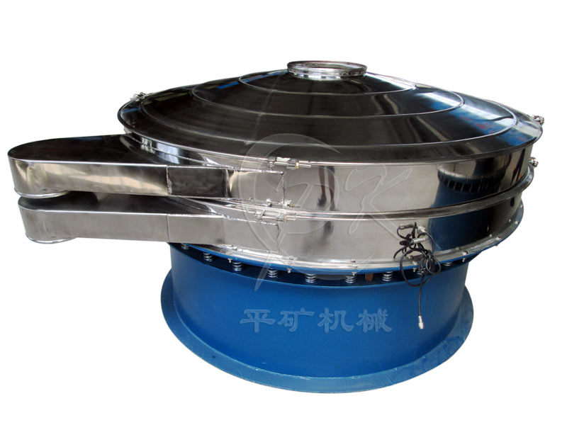 旋振篩由直立式電機(jī)作激振源,電機(jī)上、下兩端安裝有偏心重錘,將電機(jī)的旋轉(zhuǎn)運(yùn)動(dòng)轉(zhuǎn)變?yōu)樗?、垂直、傾斜的三次元運(yùn)動(dòng),再把這個(gè)運(yùn)動(dòng)傳遞給篩面,使物料在篩面上做外擴(kuò)漸開線運(yùn)動(dòng),故該系列振動(dòng)篩稱之為旋振動(dòng)篩。旋振篩具有物料運(yùn)行的軌跡長(zhǎng),篩面利用率高等優(yōu)點(diǎn),調(diào)節(jié)上、下兩端重錘的相位角,可改變物料在篩面上的運(yùn)動(dòng)軌跡.可以對(duì)物料進(jìn)行精篩分、概率篩分等。
